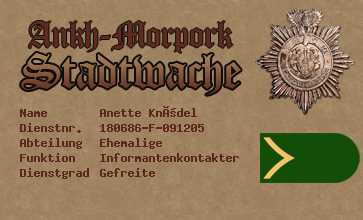 Verstorben in Ausübung ihrer Pflicht in S-Mission 1142/ Charaktereigenschaften: Anette Knödel wuchs mehr oder weniger behütet in Lancre auf, und wurde von ihren Eltern zu einer weltoffenen, freundlichen und gutherzigen Person erzogen. Sie liebte es schon immer, in den Wald zu gehen, um dort zu tanzen, zu singen und mit den Tieren zu reden und zu spielen. Eines Tages beschloss sie, nach Ankh-Morpork zu ziehen, um dort ihr großes Glück zu finden. Auf dem Weg dorthin traf sie einen alten Landstreicher, der ihr riet, ihr Glück mal bei der Näherinnengilde zu versuchen. In Ankh-Morpork angekommen, ging sie schnurstracks zu eben jener Gilde, verließ diese jedoch schon nach kurzer Zeit, da sie bemerkte, dass Näherinnen nicht wirklich etwas mit Nadel und Faden zu tun hatten. Allein und ohne Freunde streunte sie durch die Straßen der Stadt, wo sie auf einen freundlichen Wasserspeier. Während sie sich mit ihm unterhielt, sah sie in der Ferne einen Fremden, und der Wasserspeier erklärte ihr, es müsse sich um einen Wächter handeln. Anettes Interesse war geweckt, und so bewarb sie sich bei der Stadtwache.... Anette Knödel ist das, was man als "schöne Frau" bezeichnet. Alerdings weiß Anette selbst nichts über ihre Reize, denn sie wurde unter anderem auch zur Bescheidenheit erzogen. Ihr Haar ist Schulterlang und dunkelbraun, jedoch mit vereinzelten blonden Strähnen durchzogen. mit 1,82 Metern ist Anette für eine Frau relativ groß und mit 70kg auch ziemlich schlank. Anette ist eine Person, die gerne auf Fremde zu geht, egal, ob es sich um einen schwer bewaffneten Troll oder ein kleines Mädchen handelt. Sie verbrachte, bevor sie zur Wache kam, ihre Freizeit damit, zu tanzen und zu singen. Ein besonderes Talent Anettes scheint zu sein, Fremde zum Singen und zum Tanzen zu bringen. Zumindest war das in ihrer Heimat Lancre so. In Ankh-Morpork wird sie meistens von einem wütenden Mob verfolgt, der sich über die Ruhestörung beschweren will. Anette wuchs mit dem Gedanken auf, dass irgendwo tief in jeder Person etwas Gutes steckt, auch, wenn es sich gut versteckt hält. Aufgrunddessen ist sie ziemlich vertrauensselig, aber auch naiv. Sie wirkt nicht nur durch ihre Naivität etwas dumm, sondern auch dadurch, dass sie Zusammenhänge und Anspielungen erst dann versteht, wenn sie ihr wirklich ausführlich erklärt werden. Auch mit Ironie tut Anette sich furchtbar schwer, was sie schon oft in schwierige Situationen gebracht hat. Alles in Allem ist Anette Knödel eine reizende junge Dame mit einem Hang zu Gesang und Tanz. Allerdings ist sie auch schlichtweg...dumm. Ehemalig seit 11.02.2007 Aktualität: Letzter Fall: 12.10.2007 – Letztes Charakterisierungs-Update: vor dem 23.3.2011 | |||||||||||||||||||||||||||||||||||