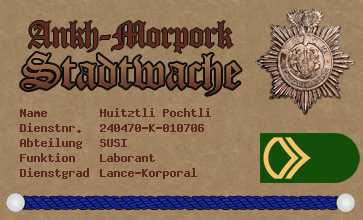 ![]() ![]() ~~~~~~~~~~~~~~~~~~~~~~~~~~~~~~~~~~~~~~~~~~~~~~~ Personenbeschreibung (31.01.09) Spezies: Wasserspeier Herkunft: Tezumanisches Reich, verfallene Tempelanlage in der Nähe des YoYo-Sees Größe: 1,20 m Alter: 94 Jahre Gewicht: 195,9 kg Material: schwarzer Onyx, durchzogen von Adern aus weißem Onyx Augen: silbrig glänzend mit schwarzern Pupillen Fremdsprachen: Morporkianisch, Tezumanisch Aussehen: Huitztli hat eine gedrungene Gestalt und neigt zur Untersetztheit. Seine Hände und Füße haben sehr scharfe Krallen und er muss stets aufpassen andere nicht zu verletzen. Auf dem Rücken hat er zwei große fledermausartige Schwingen, die er jedoch meißt gefaltet trägt und nur selten ausbreitet. Er hat noch nie versucht, mit ihnen zu fliegen. Der Kopf ist werwolfsähnlich mit zwei dicken etwa 20 cm langen spitzen Hörnern darauf. Die Ohren erinnern an solche von Schäferhunden. Huitztli kann sie hin- und herdrehen. Kleidung: Von einem befreundeten Zwergenschneider hat sich Huitztli eine Arbeitsweste für Arbeitseinsätze aus Leder und dunkelgrünem Segeltuch anfertigen lassen, die auf der Vorderseite viele Taschen hat. Er trägt anders, als die meißten Wasserspeier ein paar Bermudashorts ebenfalls aus dunkelgrünem Segeltuch. Huitztli kann gut: - anderen zuhören. - sich in andere hinein versetzen. - Kälte und Hitze aushalten (machen ihm nichts aus). Huitztlis Schwächen: - Ist allergisch gegen Tauben. - Ist wegen seiner Körpergröße auf Trittleitern oder Bänkchen angewiesen. - Hat Probleme, emotionale Distanz zu wahren. Das Schicksal von Opfern und Hinterbliebenen geht ihm oft zu nah. - Sein Körpergewicht bereitet Probleme, insbesondere in Situationen, bei denen der Untergrund nur eingeschränkt tragfähig ist. ~~~~~~~~~~~~~~~~~~~~~~~~~~~~~~~~~~~~~~~~~~~~~~~ Sein Werdegang in eigenen Worten: Wie ich meinen Weg hierher nach Ankh-Morpork fand und ausgerechnet auch noch in der Stadtwache landete? Nun... Ich, Huitztli Pochtli, entstamme einem Wasserspeiergeschlecht aus dem Tezumanischen Reich. Der Tempelkomplex, in dem meine Familie lebte, zerfiel zusehends und eines Tages während eines heftigen Sturms inmitten der Regenzeit, löste sich mein Sockel und ich stürzte vom Dach. Hätten nicht dichte Sträucher und wucherndes Unkraut meinen Sturz abgebremst, ich verfügte heute nicht mehr über alle Körperteile. Der Zufall wollte es, dass ausgerechnet an der Stelle meines Aufschlags die Priester über Jahrhunderte den Altarabfall zu entsorgen pflegten. Dies muss den stinkenden dreckigen Schlamm in geweihten stinkenden dreckigen Schlamm verwandelt haben, zumindest hauchte mir diese Begebenheit Lebendigkeit ein. Dem Schlamm meiner Heimat wurde ja schon immer eine heilsame Wirkung nachgesagt. Niemand hat behauptet, er würde dabei auch gut riechen. Nach meiner Erweckung waren die ersten Emotionen, die ich verspürte: Schmerz, Schmerz und Schmerz. Habe ich schon den Schmerz erwähnt? Dann vernahm ich ein Grollen aus meinem Bauchinnern. Später erfuhr ich, dass man es auch als Hunger bezeichnete. Dummerweise wusste ich nicht, welche Nahrung ein Wasserspeier im Allgemeinen zu sich zu nehmen pflegt und experimentierte mit diversen Pflanzen. Nach längeren Phasen von Übelkeit, die sich mit solchen von Euphorie gemischt hier und da mit wirklich interessanten Geruchs-, Geräusch und Farbempfindungen abwechselten, stellte ich fest, dass pflanzliche Kost nicht wirklich mein Ding ist. Ich entschloss mich dazu, es in eine andere Richtung zu versuchen und verzehrte meine erste Ratte. Nachdem aber jedoch weitere Familienmitglieder zu mir kamen, weil sie ihren Großvater vermissten und ob ich ihn denn gesehen hätte, strich ich Ratten gedanklich von meinem Speiseplan. Einer inneren Stimme folgend, versuchte ich der Priesterschaft stets aus dem Weg zu gehen. Leider kam es eines Tages zu einer unliebsamen Begegnung, die mich dazu veranlasste meiner angestammten Heimat den buckligen Rücken zu kehren und mich in die Büsche des dichteren Dschungels mittwärts zu schlagen. Nach tagelanger Wanderung wurde der Urwald immer lichter und wich schließlich vollends zurück. Ich wanderte immer weiter und gelangte in eine Wüstengegend. Da hier das Nahrungsmittelangebot und nicht zuletzt das Wasser eher gering sind, gelangte ich vom Wandern über das Umherirren schließlich zum Dahinkriechen. Ich weiß nicht, ob man es Glück nennen sollte, doch am Morgen nach meiner körperlichen Kapitulation erwachte ich inmitten von Leuten, die mich sitzend umringten und die ich noch nie zuvor gesehen hatte. Die überaus große Wärme, die sich innerhalb kürzerer Zeit an einer rückwärtigen Region meines Körpers ausbreitete, ließ mich schmerzerfüllt und die Menschengruppe schreckerfüllt aufschreien. Allerdings dauerte es nicht lange, bis der Missionierungseifer, die offensichtliche Furcht vor mir überwog. Man erzählte mir von Om und warum er nicht nur der bessere, sondern überhaupt der beste Gott sei. Ich erhielt neben theologischem Unterricht jede Menge Schriften und Flugblätter und nachdem ich gestehen musste, nicht lesen zu können, auch noch entsprechenden Unterricht. Ich zog mit dieser Truppe in Richtung eines „Sündenpfuhls“, wie sie es nannten, den sie trocken zu legen gedachten. Ich war ganz gespannt darauf, was das wohl sein mochte und hatte nur eine vage Vorstellung von einem großen Schlammloch von ähnlicher physischer und olfaktorischer Konsistenz, wie jenes, der ich meiner Erweckung verdankte. So erreichte ich schließlich Ankh-Morpork und meine Begleiter nach einem Vorstoß ins Herz der Verderbtheit das Ende ihrer irdischen Existenz. Später erfuhr ich, dass sich selbst Wächter nie allein in die Schatten begeben, es sei denn, man sei Depressiv und hege Selbstmordabsichten oder sei schlicht verrückt. Die Wächter, die mich zitternd an eine Regenrinne geklammert vorfanden, brachten mich zunächst auf die Wache. Dort gelang es endlich, die Regenrinne aus meinen Klauen zu befreien und seinem fl